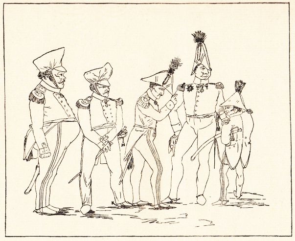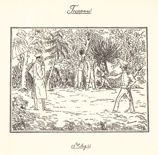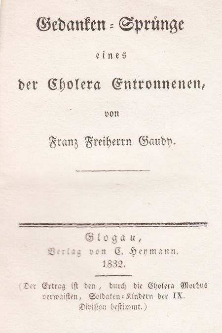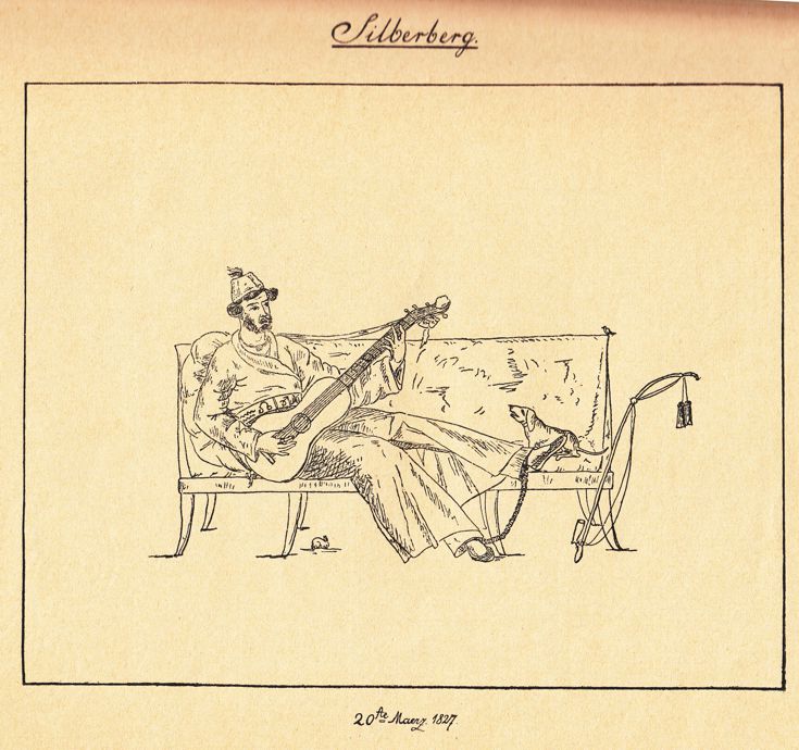 Gaudy stellt sich hier in einer Zeichnung aus seinem Karikaturenbuch in der klassischen Dichterpose dar: wie Apoll mit der Leier, wie es seit der Antike überliefert ist, aber gefesselt. Mit dieser Pose rettete er sich durch die schwere Lebenskrise, die er 1824/25 nach dem Verlust allen Erbes, der Trennung von seiner Verlobten und dem Zwang zum Verbleib bei der Armee ohne Ausblick auf eine sinnvolle Zukunft erlitt. In seiner Not schrieb er aus Silberberg 1827 an August von Blumröder, Politiker und Schriftsteller, dem er 1829 in Erato die Wasserrosen widmete: „ Auf unfruchtbarer Klippe steht ein mit nackten Wurzeln sich mühsam anklammernder Dornstrauch: weniges Laub, halbverwelkte Blüten, ein Raub der Stürme, ungenießbare Früchte – aber lange zackige Stacheln. Und mit einem tiefen, bangen Seufzer muß ich sagen: ,me voila!‘" |