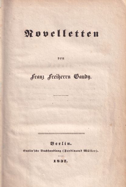 Ludwiga. 1839. Ludwiga schildert mit der jungen Comtesse Ludwiga die Welt des alten Adels in ihrem unausweichlichen Niedergang im Spiegel der allgemeinen Gesellschaftsgeschichte. Die Erzählung schildert das Zusammentreffen aller: die pfälzischen Auswanderer, die zu Fuß mit dem Handwagen unterwegs sind, die braven Bürger im biedermeierlichen Landstädtchen, den Künstler, der seinen Platz in der Gesellschaft zu finden sucht, den alten Leutnant, der sich mühsam in einer Lehmhütte eingerichtet hat, den alten Adel in gewohntem Glanz mit Schloß und treuem Diener, den jungen Adel in ererbter Adels-Arroganz und herzloser Überheblichkeit im Niedergang der neuen Zeit. |