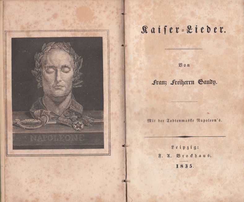 Die Kaiser-Lieder umfassen 27 Lieder von der Jugend Napoleons über den siegreichen Aufstieg zum Beherrscher fast ganz Europas bis hin zu seinem Tod auf St. Helena, der fernen Insel im südlichen Atlantik. Sie sind ein einziger Lobpreis des militärischen Siegers, des historischen Helden. Mit diesem Werk wurde Gaudy deutschlandweit als bedeutender Autor wahrgenommen. Gaudy beschwört Napoleon als den großen, „für die Erde zu früh gesunkene[n] Agitator“, der die blutige Revolution mit seinem Schwert beendete, die alten Herrschaften zertrümmerte und ein „Vaterland Europa“ unter französischer Herrschaft schaffen wollte. Die lebhafte politische Literatur-Kritik warf ihm einen einseitigen Lobpreis des Tyrannen und Plünderers Europas vor, den man in den Befreiungskriegen mühsam niedergerungen habe. |