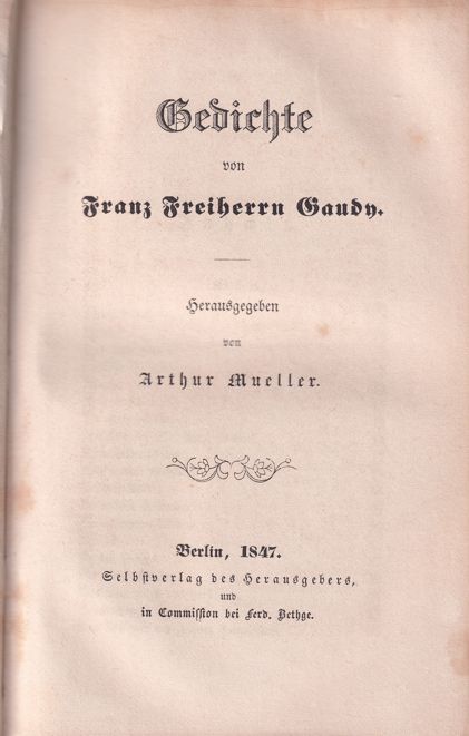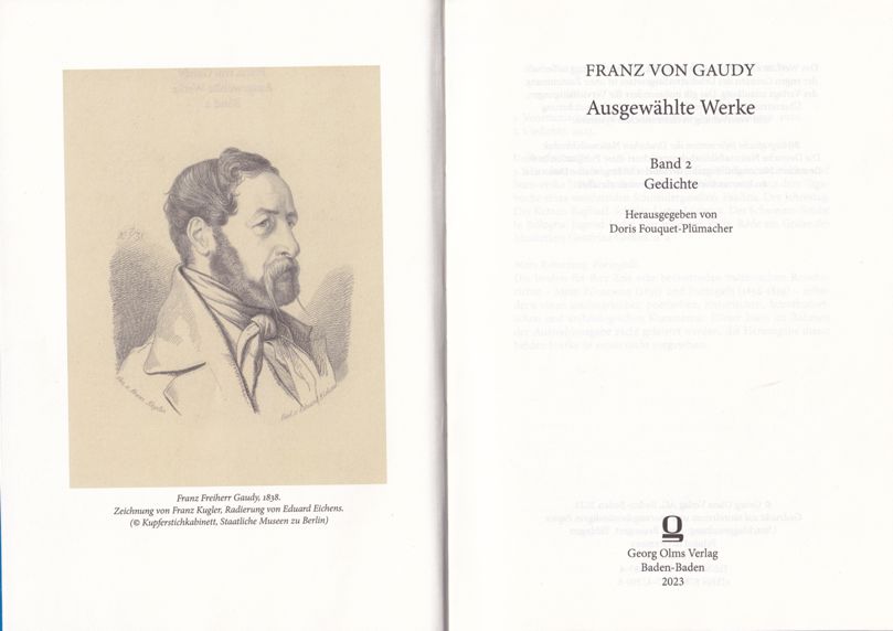 Gaudy hat ein umfangreiches poetisches Oeuvre geschaffen: Gedichte, satirische Verse, Romanzen, Balladen, Bildgedichte, Spott- und Scherzgedichte, politische Gedichte, Verserzählungen. Diese Auswahl aus seinem lyrischen Werk enthält die von ihm selbst getroffene Auswahl, 1847 herausgegeben von Arthur Müller. Sie wurde 2023 als Band 2 der Ausgewählten Werke mit Darstellung seines lyrischen Schaffens, ausführlichem Kommentar sowie den Bildern der Bildgedichte und einem Verzeichnis der Vertonungen neu herausgegeben. |