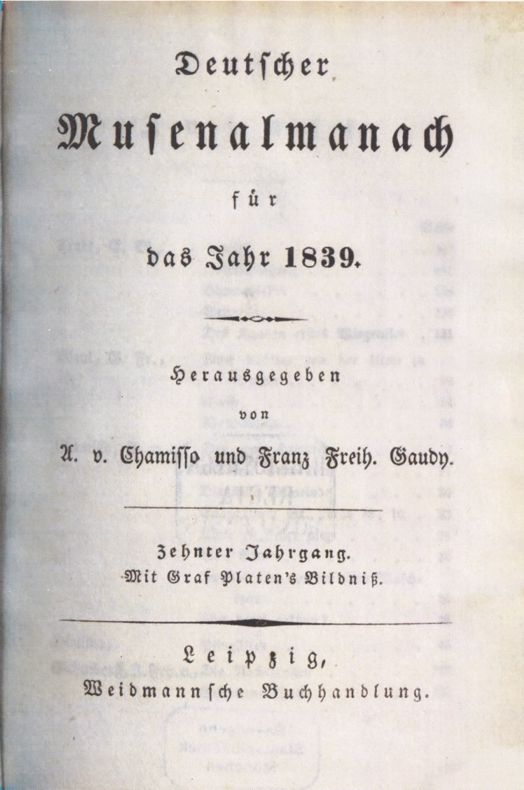 Gaudy unterstützte Chamisso intensiv bei der Herausgabe des Musenalmanachs. Den Jahrgang 1839 gab er alleine heraus; hier wählte er als Frontispiz das Porträt von August von Platen und schloß damit den Literaturskandal der Zeit aus dem Anfang der 1830er Jahre ‒ die schwere Auseinandersetzung von Platen und Heinrich Heine ‒ begütigend ab. Der Jahrgang 1840 mit Gaudys eigenem Porträt erschien unter anderem Herausgeber und enthält viele Gedichte aus seinem Nachlaß. |